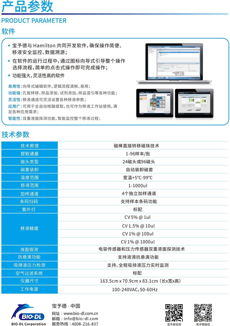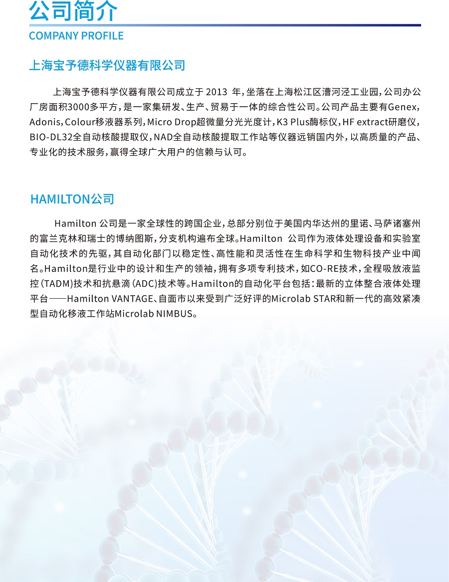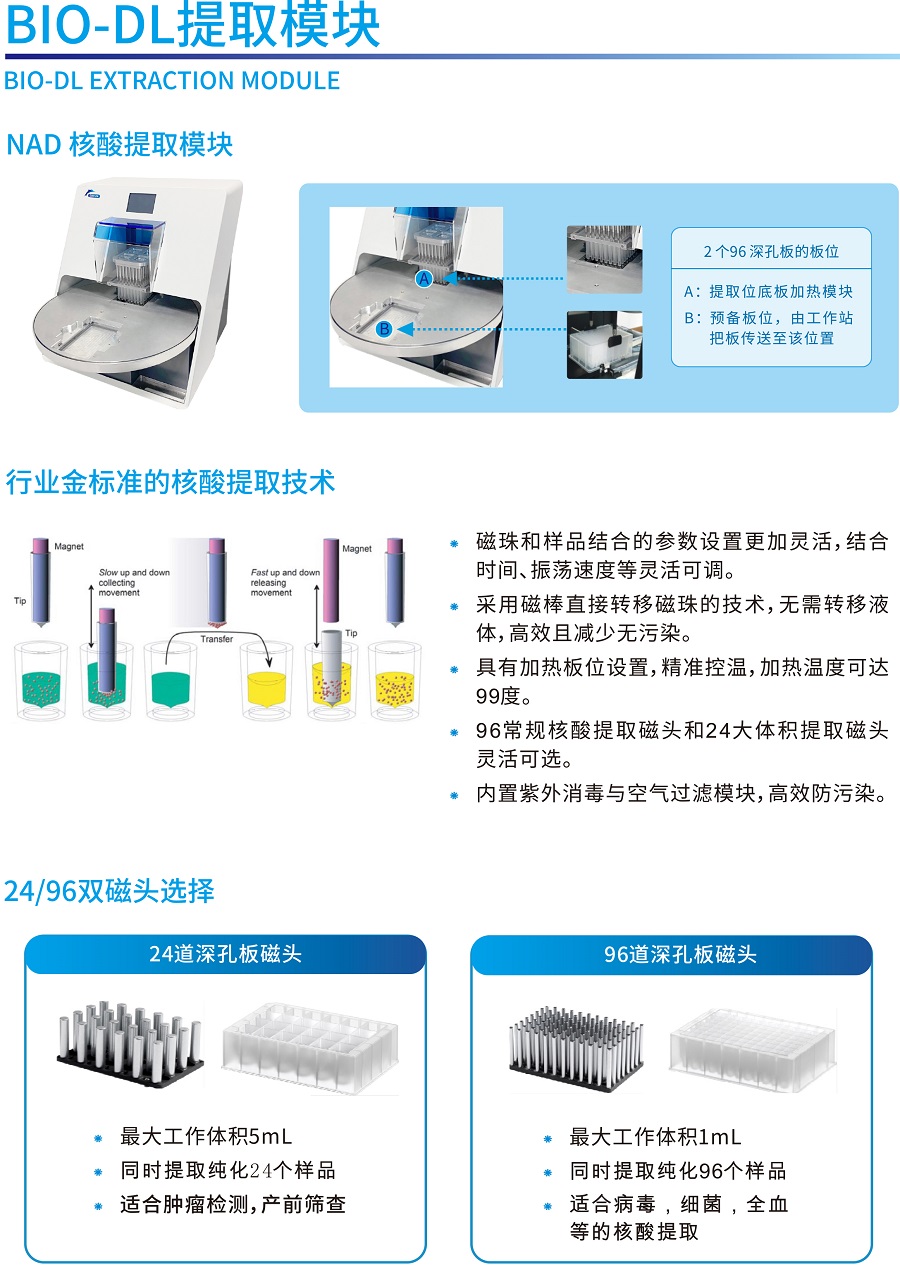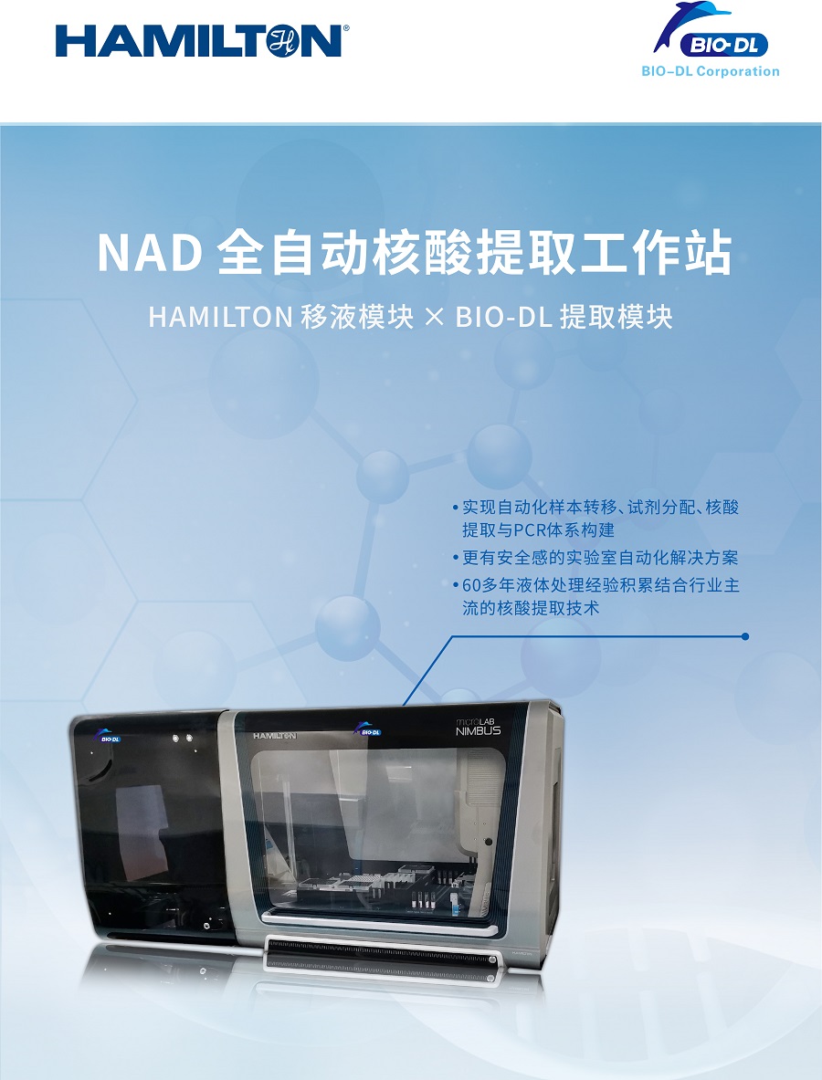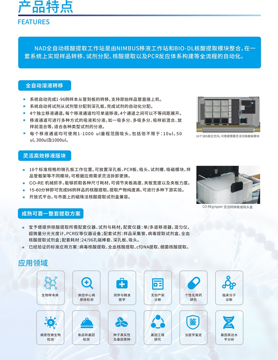 實(shí)現(xiàn)自動(dòng)化樣本轉(zhuǎn)移、試劑分配、核酸提取與PCR體系構(gòu)建;更有安全感的實(shí)驗(yàn)室自動(dòng)化解決方案;60多年液體處理經(jīng)驗(yàn)積累結(jié)合行業(yè)主流的核酸提取技術(shù); NAD全自動(dòng)核酸提取工作站是由NIMBUS移液工作站和BIO-DL核酸提取模塊整合,在一套系統(tǒng)上實(shí)現(xiàn)樣品轉(zhuǎn)移、試劑分配、核酸提取以及PCR反應(yīng)體系構(gòu)建等全流程的自動(dòng)化。
